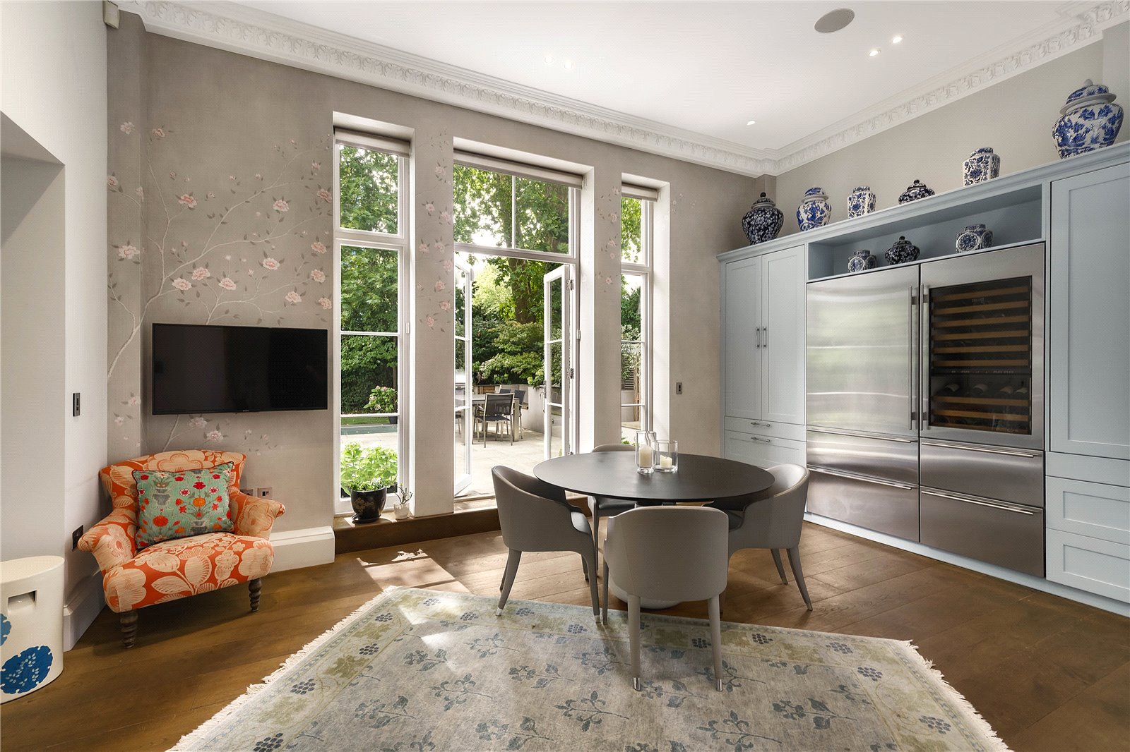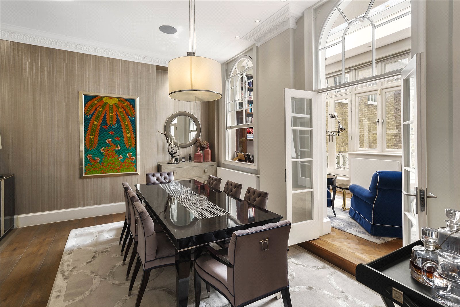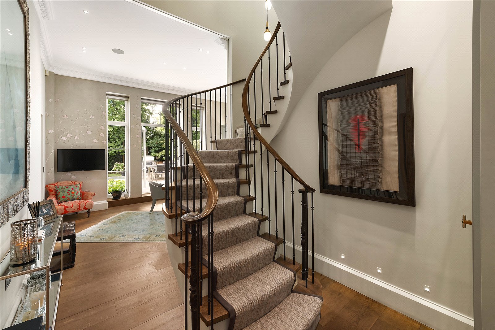 Outside, in addition to the courtyard, a mature and meticulously landscaped garden offers a tranquil retreat for relaxation or entertaining. Extending to approximately 3,165 sq ft, it is one of the largest private outdoor spaces in this part of London.