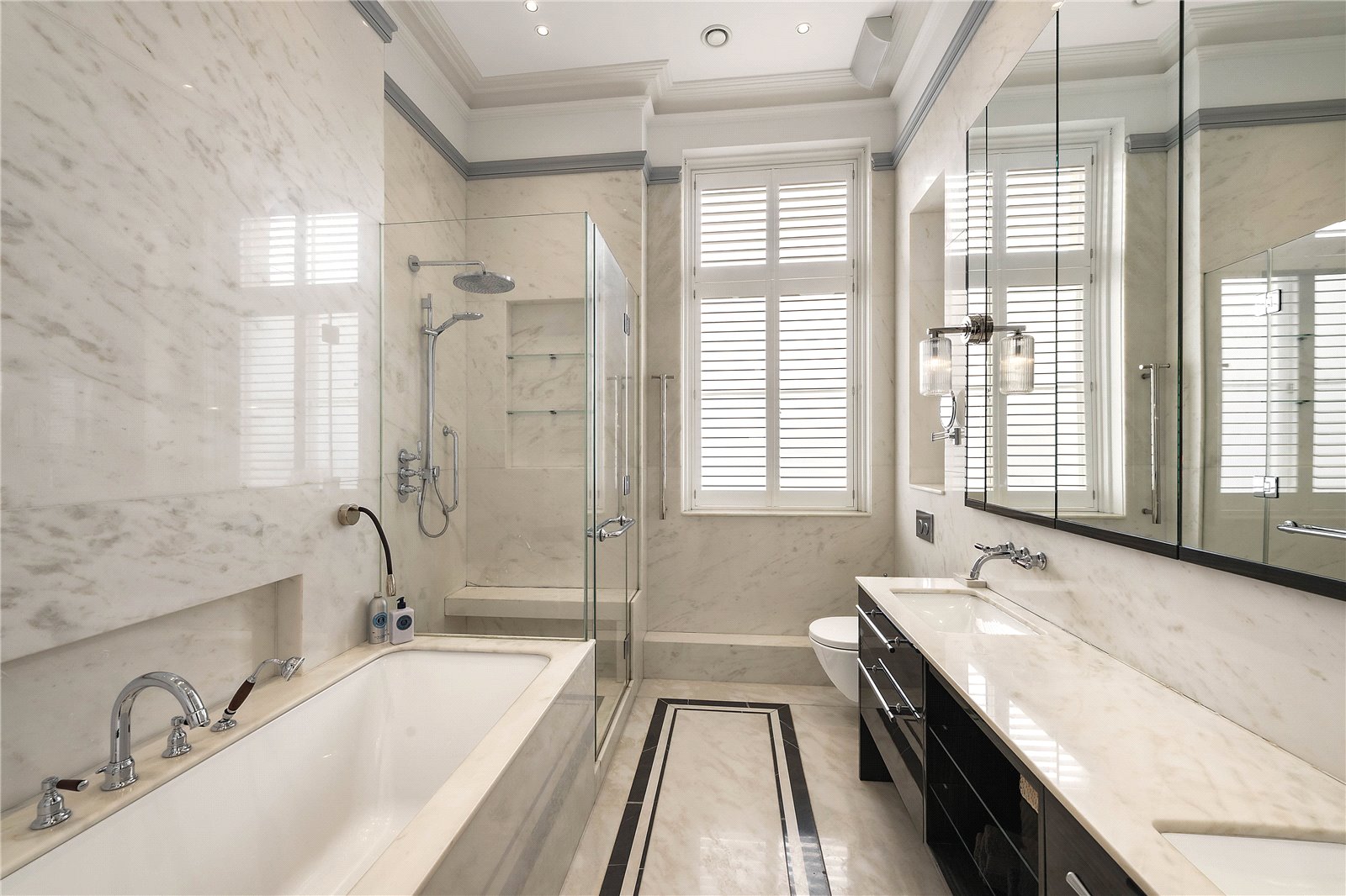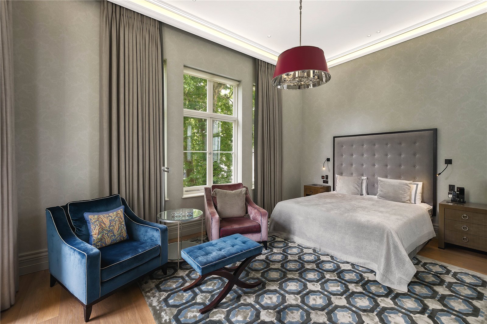 A sweeping staircase leads to the first floor, home to the exceptional principal suite with 3.76m ceilings, a superb dressing room with floor-to-ceiling wardrobes, and views towards Hyde Park. This level also includes an additional bedroom suite, a sitting room, and a private terrace.