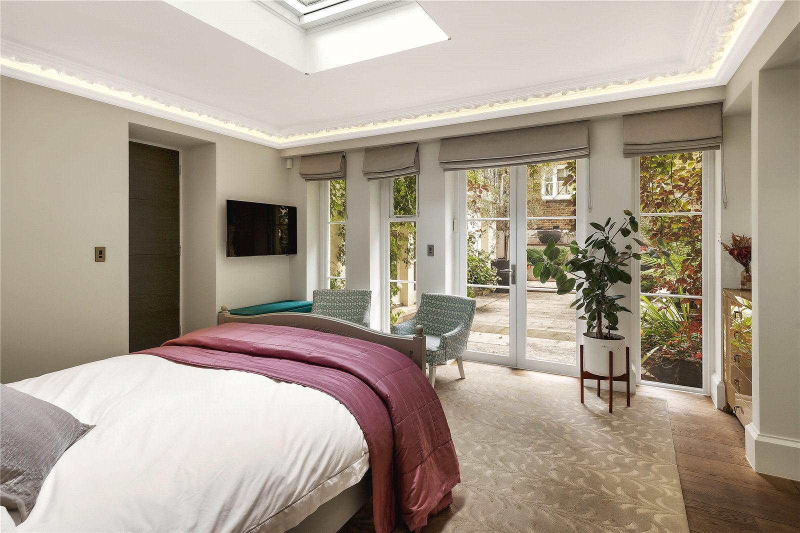 The lower ground floor accommodates the remaining bedrooms, with the two largest opening onto a secluded courtyard through floor-to-ceiling windows and French doors, creating a particularly light and airy feel.